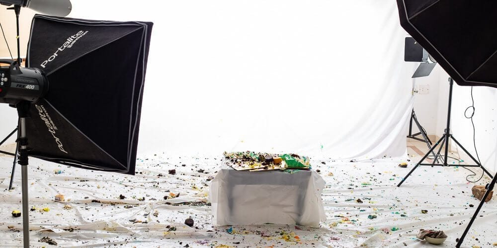 To keep the location clean, we taped several sheets of white plastic o the floor, this was replaced for the evening shoot.